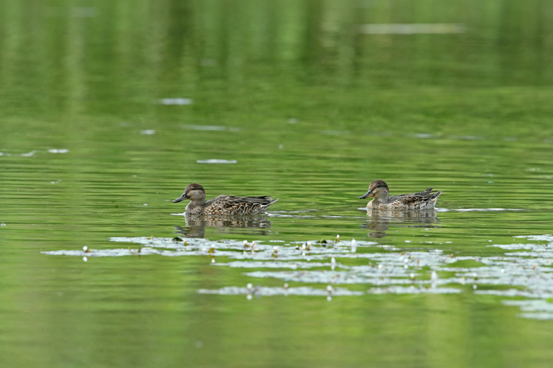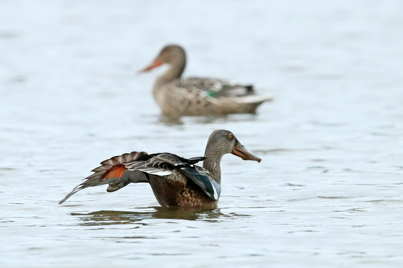 ![]() ハシビロガモ ♂ エクリプス 奥は ♀ 2023年9月20日 長野県 安曇野市 |