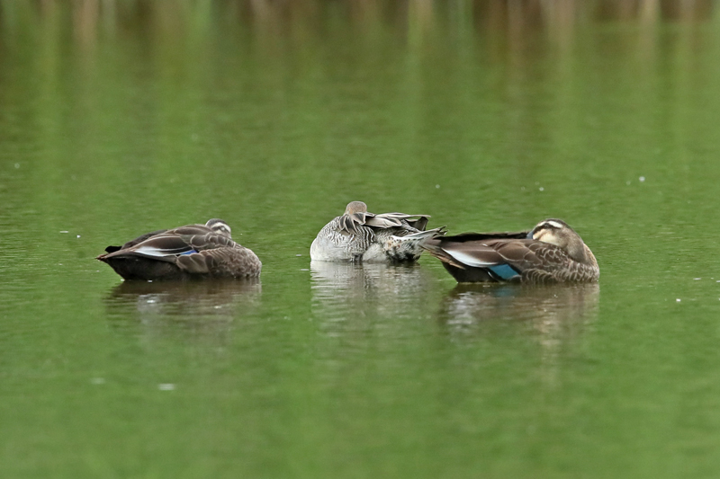 ![]() オナガガモ ♂ 中央 エクリプス→生殖羽換羽中 2023年9月20日 長野県 安曇野市 左右の2羽はカルガモ |