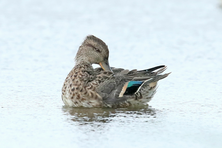 羽繕いを待つ。雨覆と2本の白帯で、雌雄の識別と成鳥か幼鳥かの識別が出来る。2時間張り付いて、羽繕いをしっかり見せてもらった。綺麗な白帯と、斑や褐色味がない雨覆から♂エクリプス。 左は参考のコガモ。コガモも白帯が2本あるが、たいてい白地にバフ色が付いている。 半年ぶりのカモの識別。あれこれ思い出すのに時間がかかる。結局、教科書を引っ張り出して、そうだったとなる。年寄り頭は困ったもので。 |